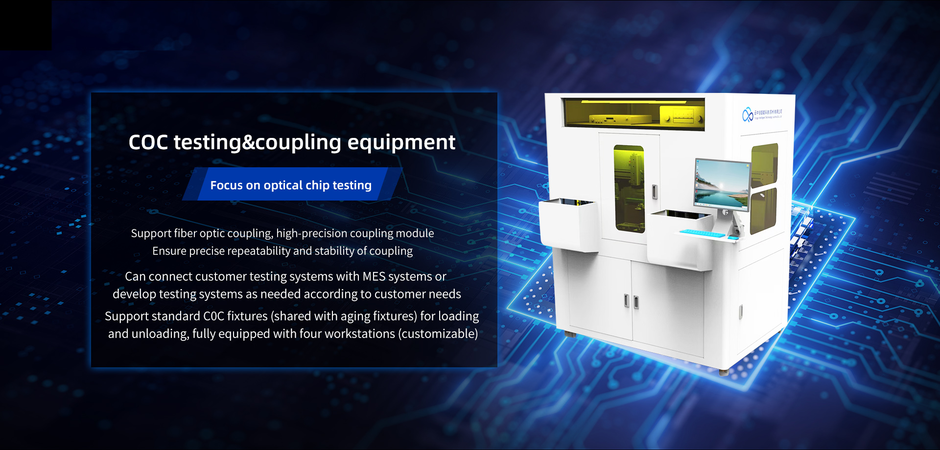 Yunzhonggu Intelligent Technology (Suzhou) Co., Ltd. is a high-tech company with the mission of developing intelligent equipment. The company focuses on the research and development of mechanical, electronic, and software technologies, serving various industries such as semiconductors, optical communications, automotive components, biomedicine, and new energy. Yunzhong Valley has mature solutions in the optical communication industry, including LIV testing, aging testing, optical chip coupling, and optical chip detection processes. The company's R&D team currently has multi-level talents such as doctoral and master's degrees, and has jointly established an artificial intelligence application technology laboratory with the Kunshan Innovation Center of Zhejiang University. The team closely focuses on multiple technological directions such as automation and artificial intelligence to provide customers with in-depth equipment development services. The company currently holds multiple invention and utility model patents, as well as software copyrights. The company is based in the Yangtze River Delta, driven by technological innovation, and aims to become an excellent enterprise in the industrial intelligent equipment industry.