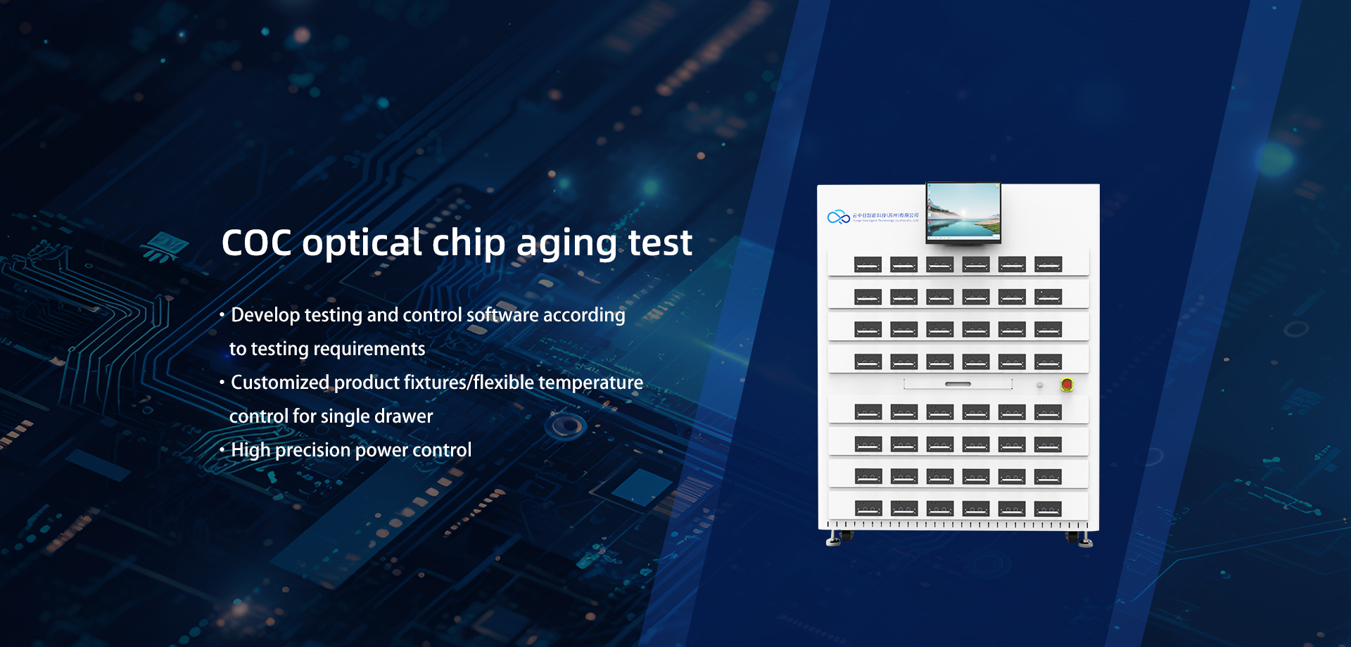 Yunzhonggu Intelligent Technology (Suzhou) Co., Ltd. is a high-tech company with the mission of developing intelligent equipment. The company focuses on the research and development of mechanical, electronic, and software technologies, serving various industries such as semiconductors, optical communications, automotive components, biomedicine, and new energy. Yunzhong Valley has mature solutions in the optical communication industry, including LIV testing, aging testing, optical chip coupling, and optical chip detection processes. The company's R&D team currently has multi-level talents such as doctoral and master's degrees, and has jointly established an artificial intelligence application technology laboratory with the Kunshan Innovation Center of Zhejiang University. The team closely focuses on multiple technological directions such as automation and artificial intelligence to provide customers with in-depth equipment development services. The company currently holds multiple invention and utility model patents, as well as software copyrights. The company is based in the Yangtze River Delta, driven by technological innovation, and aims to become an excellent enterprise in the industrial intelligent equipment industry.